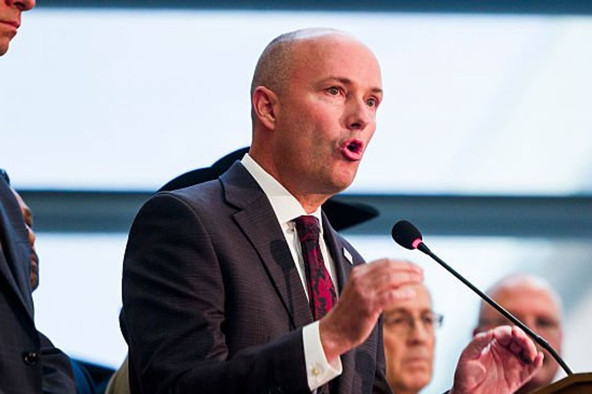 Utah Gov. Spencer Cox speaks at a press conference flanked by FBI director Kash Patel following the fatal shooting of political activist Charlie Kirk during an event at Utah Valley University on September 12, 2025 in Orem, Utah. (Photo by Michael Ciaglo/Getty Images)