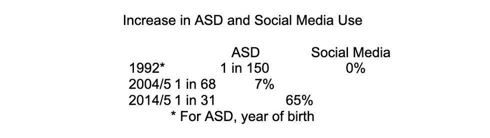 The period of rapid ASD prevalence growth coincided with the period in which internet and social media use took off (in the late 1990s). We know from Pew Research Center data that when it first started tracking social media usage in 2005, the figure was 7%. Ten years previously, there was practically no social media, so the number would have been 0. During that same period, the prevalence of autism doubled.